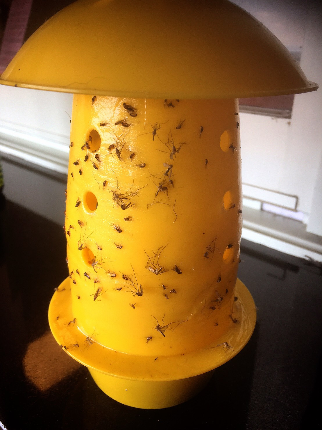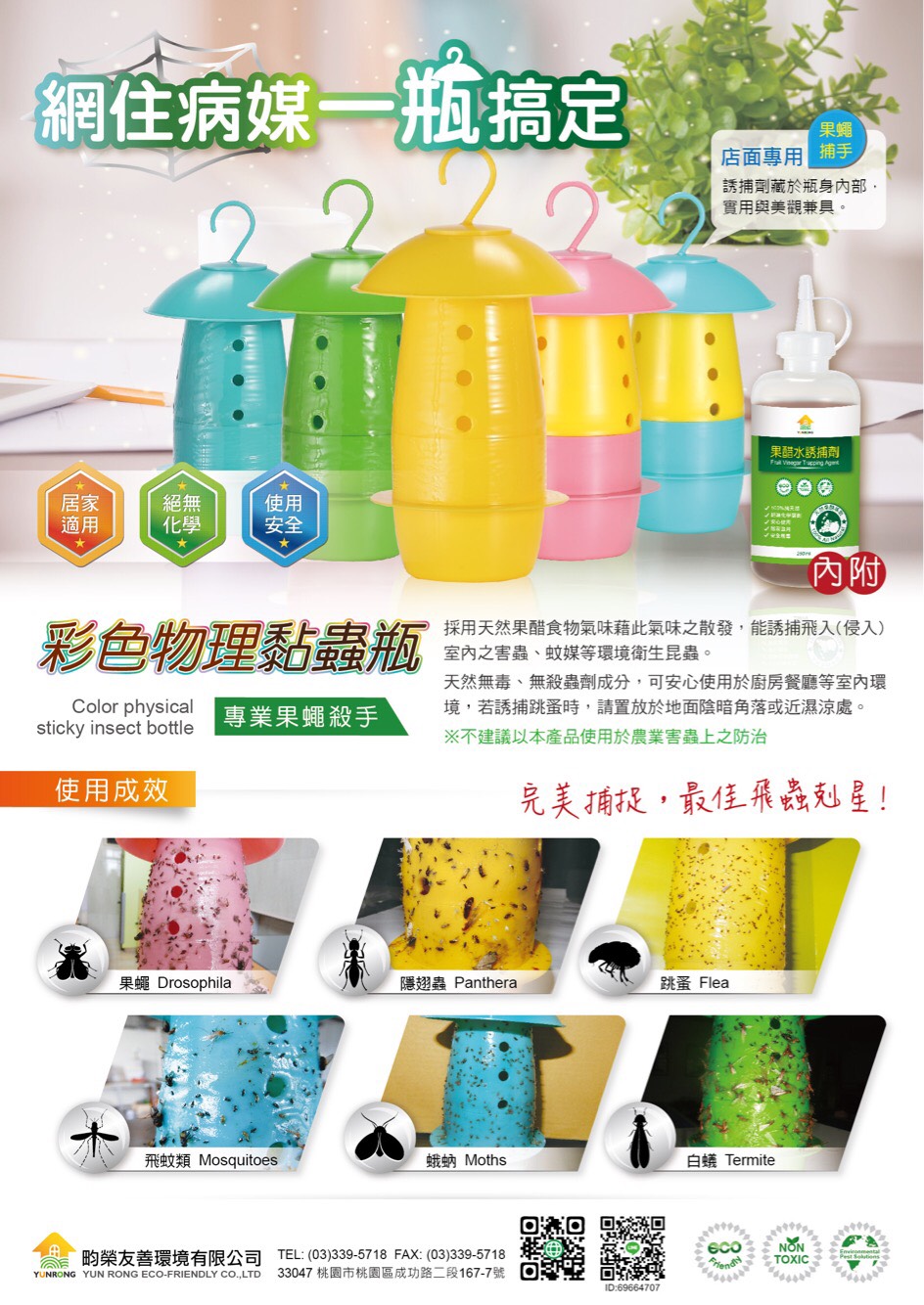 4.蛾蚋成蟲防除若不使用殺蟲劑,可選購較環保的黏蟲帶或黏蟲板(須搭配誘引劑)主動誘引黏捕浴廁或居室內部的蛾蚋成蟲,並逐漸降低其室內成蟲密度,因個環境孳生條件與密度不同而隨之遞增或遞減其防治期時間與資材使用量